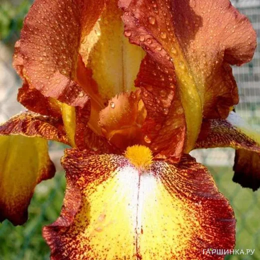 Ирис бородатый Spreckles - Пылающие, оранжево-красные лепестки с ярко-желтым пятном по центру, фолы более темные, с бордовым оттенком, а желтое пятно высветляется у бородки до белого.