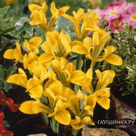 Ирис Danfordiae.Он зацветает в апреле один из первых. Миниатюрная кроха высотой всего 10 см с небольшими желтыми цветами в зеленоватую крапинку и диаметром венчика не более 5 см, отлично противостоит ночным заморозкам и другим невзгодам ранней весны. В свое время Ирис Danfordiae был обнаружен в горах Турции и введен в культуру госпожой Данфорд. На рынок поставляются чаще всего садовые клоны этого дикорастущего вида. От других представителей «луковичных ирисов» растение отличается не только карликовым ростом и отсутствием верхних «лепестков» (штандартов) у цветка, что делает его очень похожим на миниатюрный ирис, но и полной стерильностью цветков. Размножается только вегетативно, образуя одну-две небольшие по размеру замещающие луковицы и массу деток, размером с рисовое зернышко, у основания материнской луковицы. Для формирования более крупных замещающих луковиц иридодиктиум госпожи Данфорд рекомендуется посадить немного глубже, чем принято для остальных представителей рода, на глубину 6-10 см, с учетом размера посадочного материала и механического состава почвы.