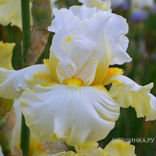 Роскошь и величие ириса сорта Домен де Курсон бросается в глаза с первого мимолётного взгляда. Надёжные и прочные цветоносы растения, высота которых стремится к метровой отметке, способны удерживать одновременно по несколько изящных лимонно-золотистых бутонов, раскрывающихся великолепными крупными цветками. Торжественные белоснежные верхние цветочные доли, называемые стандартами, чуть тонированы нежной желтизной в своей основе. Фолы, представляющие собой нижние доли цветка ириса сорта Домен де Курсон, на тон темнее чисто-белого цвета, нежная желтизна присутствует у них в качестве изысканной окантовки бежевого поля. Бородка цветка полностью окрашена в тёплый жёлто-золотистый цвет. Стандарты и фолы ириса сорта Домен де Курсон плотной текстуры, их гофрированность придаёт цветку ещё большую пышность.