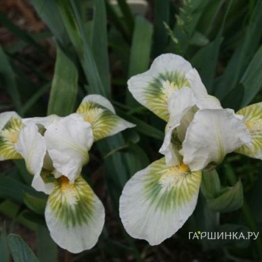 Ирис карликовый Грин Спот - Цветки простые крупные, удивительно красивой формы, нежно-белые с салатово-желтым центром. Формирует невысокие кустики высотой 30см. Цветет в мае. Отличается высокой зимостойкостью.