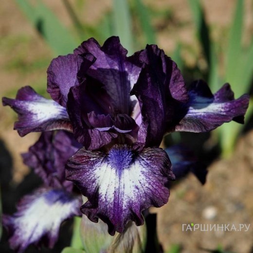 Ирис карликовый Ларрикин (Iris pumila Larrikin) - Цветки с насыщенно чернильными лепестками и сиреневыми бородками на светлых пятнах с фиолетовыми переливами по краю.