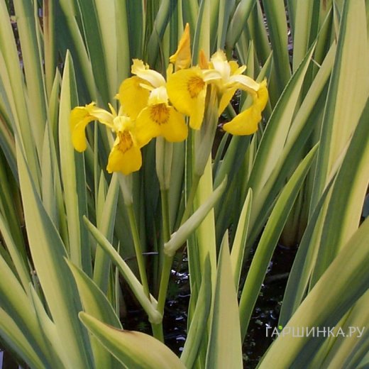 Ирис ложноаировый Вариегата - мелководное растение. Категория: ирис. Высота растения до 120 см. Стебель несет 12 - 15 цветков. Диаметр цветка 10 см. Листья с чередующимися кремовыми и зелеными полосами, к концу лета становятся полностью зелеными. Цветы желтые, с белым оттенком. В цветках ириса болотного верхние лепестки недоразвиты. Место для посадки стоит выбирать освещенное или полутень. Зона посадки: водоем, прибрежная зона. 3 зона зимостойкости.