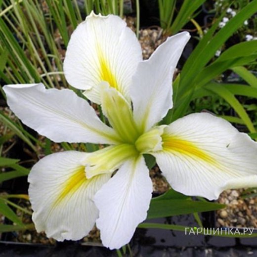 Ирис луизианский Гер Хайнесс - Цветок чистого белого цвета с желтыми мазками по центру лепестка. Неприхотливый, устойчивый сорт. Кусты высотой до 100 см. Цветки ириса крупные, до 10-12 см. Период цветения июнь. Зимостоек, укрытия требует только в регионах с суровыми зимами.