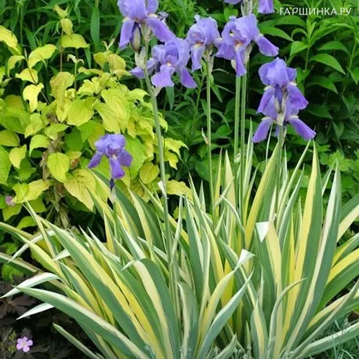 Ирис паллида Вариегата. Формирует куст до 80 см высотой и до 40 см шириной. Листья многочисленные, двухцветные, с сизым налетом, узкие. Цветки крупные, до 12 см в диаметре, фиолетовые, сердцевина желтая. Может расти на солнце и в полутени.