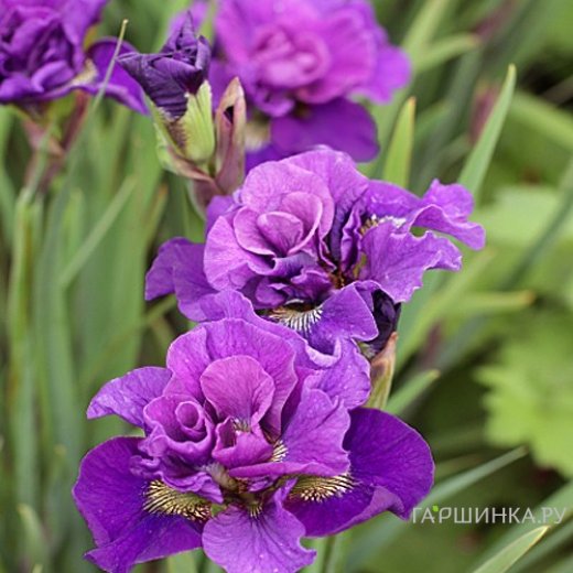 Ирис сибирский – двухцветный махровый сибирский ирис. Высота растения 80-100 см, листья линейные, заостренные, образующие густой темно-зеленый куст. Лепестки волнистые с шелковой поверхностью. Оттенок бутона лилово-фиолетовый, с пятном сапфирового цвета и белыми вкраплениями у основания нижних лепестков. Цветение в июне. Сибирские ирисы влаголюбивы, но не выносят постоянного переувлажнения. Зона зимостойкости - 4.