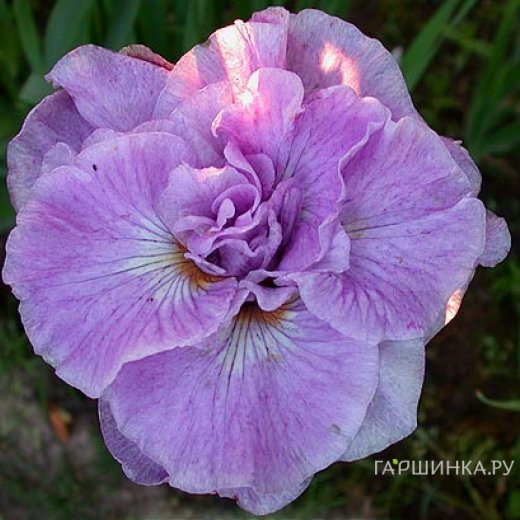 Ирис siberica Rigamarole - высокорослый, обильноцветущий сорт с крупными махровыми лиловыми цветками.