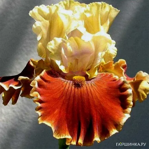 Ирис Сизнс ин зе Сан - Высокорослый ирис. Многолетнее травянистое растение. Стандарты гофрированные, бледно-желтые, фолы терракотовые. Аромат сладкий. Высота 85 см. Срок цветения средний. Предпочитает питательные, дренированные почвы, с хорошим увлажнением. Место посадки солнечное. Устойчив к заболеваниям, не требует дополнительного укрытия зимой.