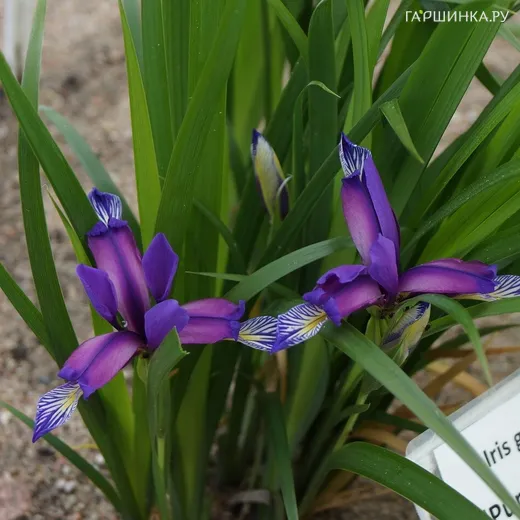 Ирис злаковидный - низкая высота (20-40 см), что делает его прекрасным выбором для создания композиций на передних планах клумбы или в бордюрах. Кроме того, этот вид имеет высокую зимостойкость и не требует укрытия на зиму. Недостатков у ириса злаковидного нет. Он довольно неприхотлив и легко адаптируется к различным условиям выращивания. Цветет рано, уже в конце мая – начале июня. Цветение продолжается 2-3 недели и является обильным. Цветонос короткий, плоский и теряется в листве. На цветоносе обычно располагается 1-2 цветка диаметром около 7 см. Цветок ириса имеет двухтоновую окраску: он пурпурно-фиолетовый со светло-желтой полосой по центру и белой штриховкой. Поверхность лепестков нежная, цветок немахровый. Аромат цветка фруктовый.