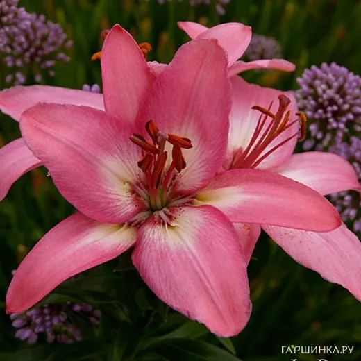 Лилия Айсберри азиатская /2шт -  Цветок двухцветный, розовый с белым центром. Высота растения 100 см. Цветки лилии  17 см в диаметре. Нежный аромат. Период цветения июнь-июль.