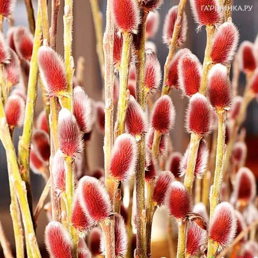 Ива тонкостолбиковая Маунт Асо (пушистые розовые почки) - невысокий, плоскошаровидный рыхлый кустарник высотой до 1,5 м. Ланцетные листья покрыты снизу серебристо-серыми волосками. Соцветия пушистые розово-красные появляются в феврале.