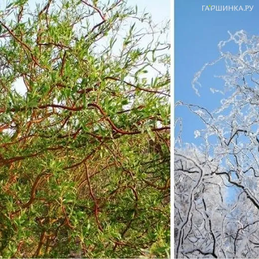 Ива Витая - красивое, декоративное, неприхотливое дерево. Ствол изогнутый, ветви скручены, лист узкий. Крона густая, легко поддается стрижке и корректировке формы. Высота 4-13м, ширина 7 м. Лист сверху зеленый, снизу голубой/белый, завернут в неполную спираль. Цветение март-апрель.