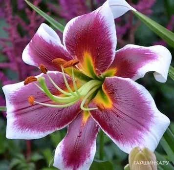Лилия Джудит Саффинья ОТ-гибрид/2шт - Цветки крупные, диаметром 22 см, малиново-бордовые с белыми кончиками. Имеет тонкий нежный аромат. Цветки направлены в сторону и вверх. Цветет июль-август. Высота растения 130 см.