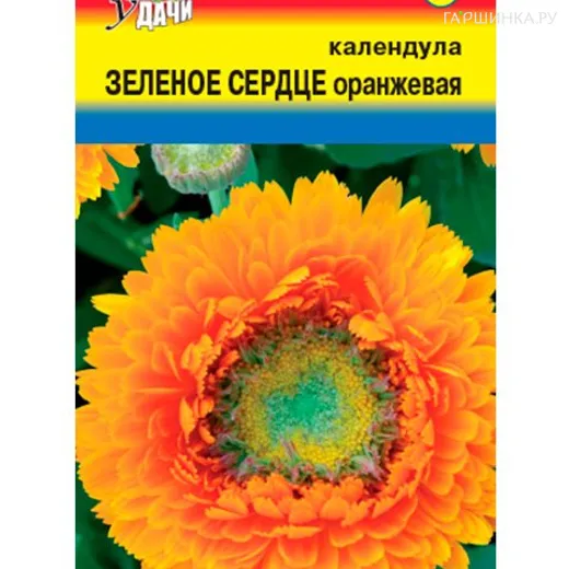 Оригинальная окраска соцветий. Обильно и продолжительно цветущее растение, высотой 50-60 см. Кустик раскидкистый, густо облиственный, с ветвистым стеблем. Соцветия – махровые, крупные (7-8 см в диаметре), оранжевые, с необычной, изящной зелёной сердцевинкой. Прекрасно смотрится в группах, рабатках, бордюрах и срезке. Высушенные цветки календулы применяются в медицинских целях.