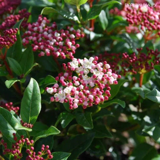 Калина Гвенллиан лавролистная - это декоративное растение, которое привлекает внимание своей уникальной красотой и полезными свойствами. Это кустарник, относящийся к семейству Адоксовые, который отличается вечнозеленой жизненной формой и умеренным темпом роста. В высоту он может достигать от 1,5 до 3 метров, а в ширину – до 2 метров. Калина Гвенллиан обладает прямыми, густо разветвленными побегами без шипов и колючек, что делает ее безопасной для выращивания в саду.