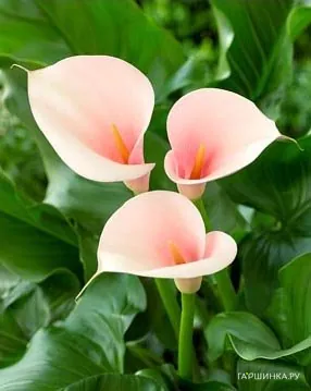 Калла Эфиопика Фламинго - многолетнее травянистое растение с клубневидным корневищем. Высота цветоноса до 50 см. Листья крупные, зеленые, сердцевидные. Соцветие - ярко-желтый початок, окруженный нежно-розовым покрывалом длиной до 10 см. Очень декоративное растение с покрывалом нежно-розового цвета.