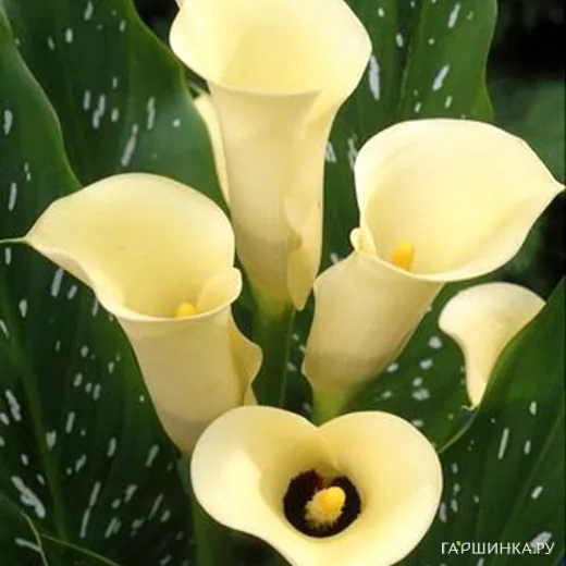 Калла Блэк Айд Бьюти - многолетнее травянистое растение с клубневидным корневищем. Высота цветущего растения 50 см.  Соцветие-початок прикрыто элегантным кремовым покрывалом с черной серединкой. Листья крупные, темно-зеленые с белыми точками.