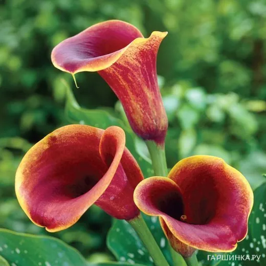 Калла Капитан Челси - многолетнее травянистое растение с клубневидным корневищем. Высота растения до 60 см. Листья  длинные, зеленого цвета с серебряными точками. Цветок - это  соцветие-початок, обернутое воронковидным листом-покрывалом рубиново-фиолетового цвета с золотисто-оранжевой каймой.