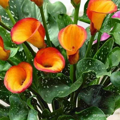 Калла Фаер Дэнсер - многолетнее травянистое растение с клубневидным корневищем. Высота цветущего растения 50 см. Диаметр цветка до 10 см, высота бокала 10-12 см. Цветки ярко-жёлтые с красным напылением по краю бокала, лист зеленый с белым крапом.