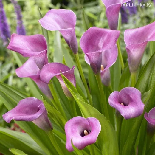 Калла Грейп Вельвет - многолетнее травянистое растение с клубневидным корневищем. Высота цветоносов 45 см. Превосходный компактный сорт с нежными светло-фиолетовыми цветками.