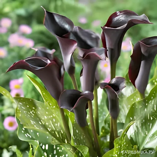 Калла Кантор — эффектный сорт клубневой каллы с глубоким, насыщенным оттенком цветков. Воронковидные покрывала окрашены в густой бордово-пурпурный, почти чёрно-сливовый цвет с бархатистым переливом. Благодаря такой окраске растение выглядит особенно выразительно в цветниках и контейнерных композициях.