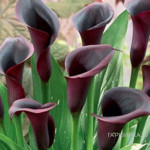 Калла Одесса - многолетнее травянистое растение с клубневидным корневищем. Высота цветущего растения 50 см. Соцветие-початок темно-бордового цвета. Листья крупные, темно-зеленые с белыми точками.