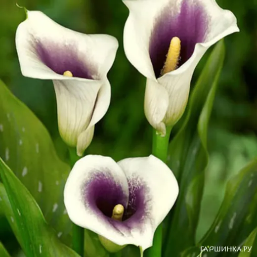 Калла Пикассо - многолетнее травянистое растение с клубневидным корневищем. Высота цветущего растения 45 см. Диаметр цветка до 8 см, высота бокала 12-15см. Цветки пурпурно-фиолетовые со светлой каймой, лист зеленый с белым крапом.