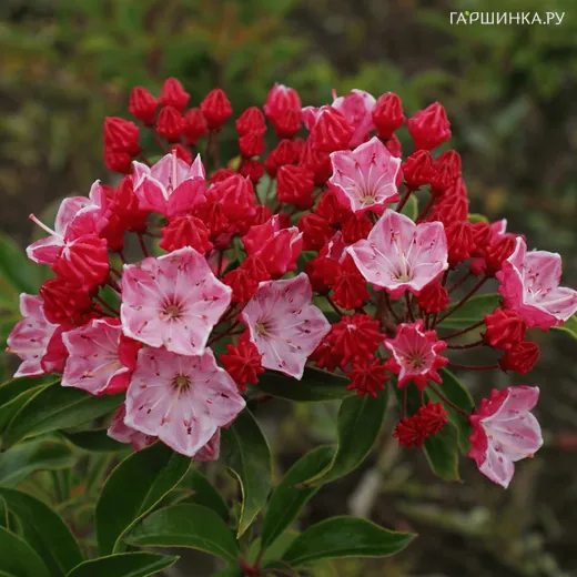 Кальмия Оливия широколистная - Кустарник высотой и шириной 3 м, плотный, густой. Листья от овальных до эллиптически-ланцетных, блестящие, темно-зеленые, длиной до 12 см. Цветки чашевидные, от светло- до темно-розовых, иногда белые (с пурпурным рисунком), диаметром 2-2,5 см, собраны в щитки диаметром 8-10 см.