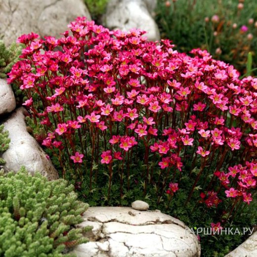 Камнеломка Рокко Ред - Вечнозеленое многолетнее растение. Цветки многочисленные, красного цвета. Листья разнообразны, могут быть кожистыми или мясистыми. Быстро разрастается, заполняя пространство.