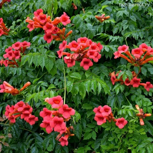 Кампсис Урсынов - оригинальное многолетнее вьющееся растение из семейства Бигнониевые. Лиана отличается отличной морозоустойчивостью, быстрыми темпами роста и большой высотой. Достигает в длину 10-15 м и ежегодно растет до 3м. Стебель древесный, прочный, с множеством воздушных корней, с присосками, цепляющимися за вертикальные поверхности. Листья сложные, непарноперистые насыщенно-зеленого цвета. Цветки – трубчатые колокольчики, карминно-оранжевого цвета, длиной до 9 см и шириной до 5 см, собраны в соцветия по 10-15 шт. Время цветения с июля по сентябрь. Предпочитает солнечные участки или слабую полутень. Любит рыхлые, плодородные, супесчаные или суглинистые почвы без застоя воды. Влаголюбивое растение, плохо переносит засуху, в жаркое время требуется регулярный полив. Данный сорт используется для вертикального озеленения беседок, пергол, опорных стен, арок, создания живых изгородей. Отлично смотрится в солитерной посадке, также задним фоном для низкорослых кустарников.