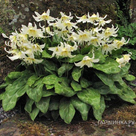 Кандык Уайт Бьюти 2 шт Высота 30-40 см. Эллиптические, слегка пестрые, богатые зеленые листья и несколько стеблей, несущих кремово-белые цветки 5-6 см в диаметре, отмеченные красно-коричневым ободком у основания лепестков. Зона зимостойкости: 5 (-29 С)