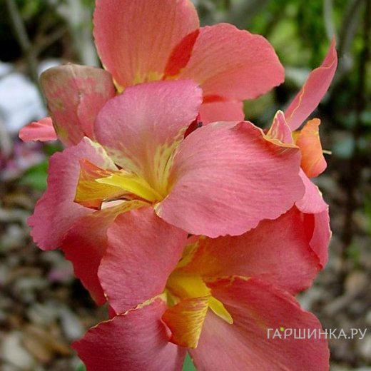 Канна Сэлмон Пинк - многолетнее корневищное растение семейства Канновые. Высота 60-70 см. Листья ярко-зеленые, крупные, декоративные. Цветки лососево-розовой окраски, диаметром до 12 см. Сроки цветения с середины лета до заморозков, декоративность – весь сезон.
