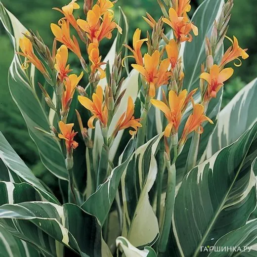 Канна Штутгарт - многолетнее корневищное растение семейства Канновые. Высота растения:180-200 см. Один из самых высокорослых сортов. Окрас соцветия: оранжевые, нарядные, очень аккуратной и пропорциональной формы. Большое декоративное значение имеют прежде всего листья. Окрас листьев: зеленый с широкими полосами белого и светло-зеленого цвета. Период цветения июль-сентябрь, декоративность – весь сезон.