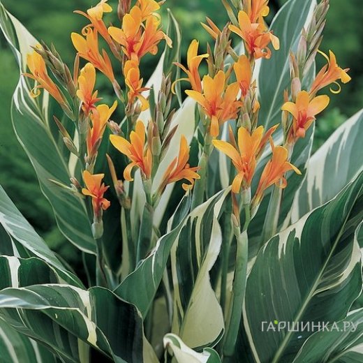 Канна Штутгарт - многолетнее корневищное растение семейства Канновые. Высота растения:180-200 см. Один из самых высокорослых сортов. Окрас соцветия: оранжевые, нарядные, очень аккуратной и пропорциональной формы. Большое декоративное значение имеют прежде всего листья. Окрас листьев: зеленый с широкими полосами белого и светло-зеленого цвета. Период цветения июль-сентябрь, декоративность – весь сезон.