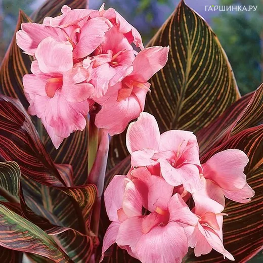 Канна Санберст Пинк - многолетнее корневищное растение семейства Канновые. Высота 90 см. Листья крупные, декоративные, полосатые, уникального желто-розово-зеленого цвета. Цветки нежно- розовые, диаметром до 12 см. Сроки цветения с середины лета до заморозков, декоративность – весь сезон.