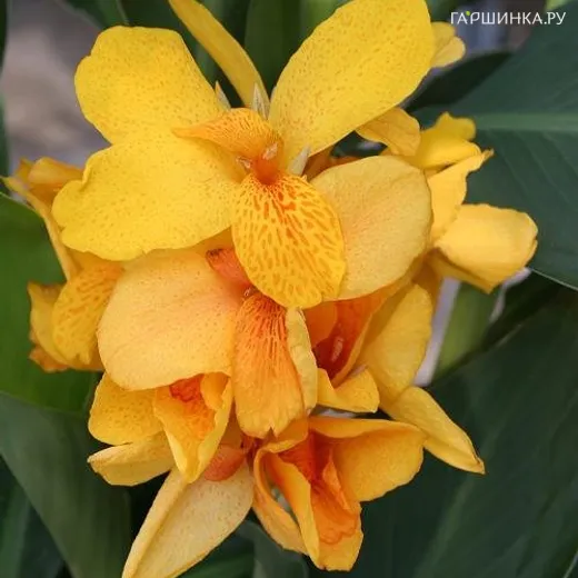 Канна Яра - многолетнее корневищное растение семейства Канновые. Высота 60 см. Цветки желтые с красным крапом, диаметром до 10 см. Сроки цветения с середины лета до заморозков, декоративность – весь сезон.