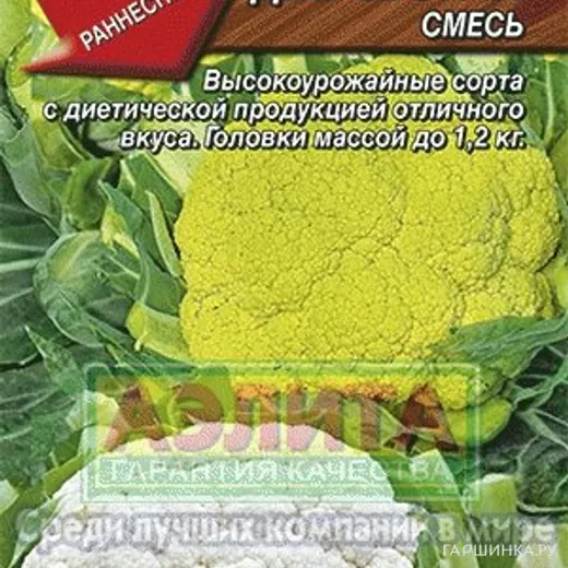 В миксе присутствуют два скороспелых сорта – «Сноуболл 123» с головкой привычного белого цвета и «Универсал» - нежно-салатового оттенка. Растения сильнорослые, с плотными округло-плоскими головками массой 1,5 кг. Оба сорта характеризуются стабильно высокой урожайностью, отличными вкусовыми качествами, высоким выходом товарной продукции и способностью противостоять погодным стрессам. Хорошо удаются как в открытом грунте, так и в теплицах. Рекомендуются для летнего и осеннего потребления в свежем виде, для замораживания и других видов консервирования. Общеизвестно, что цветная капуста по содержанию белка, витамина С и фосфора превосходит капусту белокочанную. Она низкокалорийна, содержит тартроновую кислоту, препятствующую трансформации сахаров в жировые отложения. В ее составе присутствуют специфические соединения – индолы, которые являются онкопротекторами, препятствующими появлению опухолей. Этот диетический овощ исключительно полезен диабетикам, «сердечникам», детям и всем сторонникам здорового образа жизни.