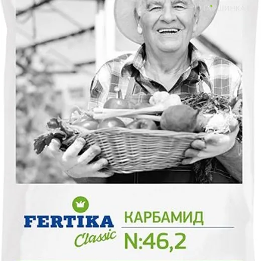 Карбамид (мочевина) Фертика - ведущее азотное удобрение, в виде белых гранул, с высоким содержанием азота 46%. Применяется при обнаружении признаков азотного голодания и в случае когда осыпается завязь плодов и ягод. Удобрение легко растворяется в воде. Рекомендуются подкормки ранней весной. Также используется как средство борьбы с садовыми вредителями, в том числе с зимующими. Следует соблюдать технику безопасности. Норму удобрения выбирают согласно инструкции, в зависимости от вида подкормки, и растений, подлежащих к обработке.