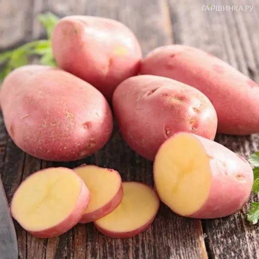 Количество клубней в гнезде — до 13 штук. клубни однородные, сходные по размеру и массе. Урожайность — 187−410 ц/га. Масса товарного клубня — 98−135 грамм. Товарность — 78−98%. Лежкость — 94%. Клубни имеют удлиненно-овальную форму, ровную поверхность без дефектов (бугров и рытвин). Кожура красного цвета, гладкая на ощупь. Мякоть светло-желтой окраски. Глазки мелкие, залегают поверхностно, почти не заметные. Содержание крахмала 13,7−16,4%
