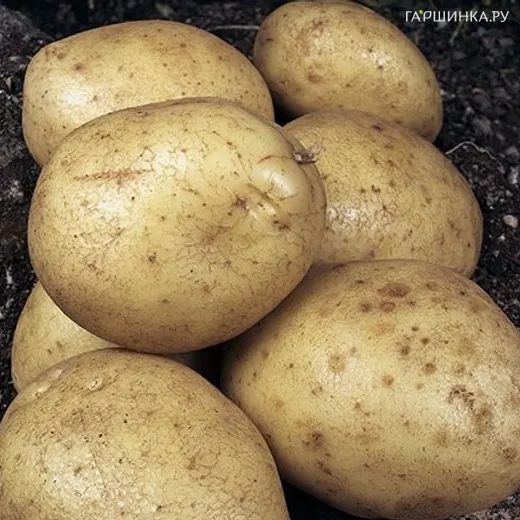 Количество клубней в гнезде — 15-20 штук, иногда до 40. Масса товарного клубня — от 80 г до 300 грамм. Клубни ровные, овальной формы, слегка приплюснутые. Кожица кремовая, покрытая шероховатой сеточкой. Глазки небольшие, поверхностные, большинство из них расположено на верхушке клубня. Мякоть белоснежная или кремовая.