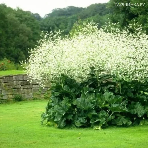 Катран кордифолия - очень мощный, эффектный многолетник, декоративен на протяжении всего сезона. Формирует куст высотой до 150 см. Листья очень крупные, глянцевые, сердцевидные, черно-зеленые, блестящие. Соцветия - большие ажурные метелки, почти прозрачные с многочисленными мелкими белыми цветками. Цветет в июне-июле.