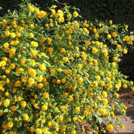 Керрия японская Пленифлора - Листопадный, быстрорастущий кустарник. По внешнему виду напоминает травянистое растение из-за того, что ее побеги практически полностью зеленого цвета, и только в самой нижней части они слегка буреют. В высоту в нашей климатической зоне он редко превышает отметку в 1 м, но зато активно разрастается в поперечнике за счет корневой поросли, до 2 м. Её ярко-зеленые прутьевидные ветви слегка повисают. Листья довольно крупные, овальные, с крупными зубчиками по краю, ярко-зелёные летом, к осени становятся жёлтыми. Цветёт керрия в мае золотисто-жёлтыми небольшими розочками, махровыми, ароматными, диаметром до 3,5-4 см, которые располагаются на концах побегов в пазухах листьев. Цветение длится 30-50 дней, может повторно зацвести осенью. В средней полосе России керрия часто обмерзает до уровня снега, но потом хорошо отрастает и обильно цветет.