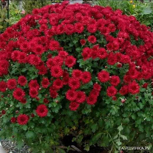 Хризантема мультифлора Бранроял Скарлет - шаровидная многоцветковая (мультифлора) многолетняя хризантема. Сорт средне-ранний (в цветение вступает с сентября), мелкие махровые цветочки красного цвета 3.5 см, куст среднерослый.