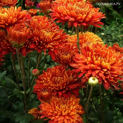 Хризантема Ватра - многолетнее среднерослое растение с прямостоячими, разветвленными стеблями. Листья насыщенно-зеленого цвета. Высота взрослого растения до 50 см. Цветок крупный, махровый уплощённой формы, красно-оранжевого цвета (зацветает желтым, а затем цвет идет к оранжево-красному и красному), диаметром до 9 см. Зацветает в середине июля.