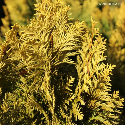Похож на тую восточную Aurea Nana и имеет такую же лимонную окраску. Рост медленный, в 10 лет около 1 м. Станет украшением сада, красиво смотрится среди зеленых хвойников. Зона 4.