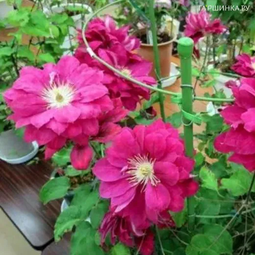 Клематис Акафудзи крупноцветковый (2) - сорт японской селекции. Цветки диаметром 8-12 см, в основном полумахровые, пышные. Лепестки от красных до красно-пурпурных, очень красиво сочетаются с длинными жёлтыми пыльниками. Окраска лепестков не тускнеет на солнце. Цветение в мае-июне на прошлогодних побегах и в августе на побегах текущего года. Высота 150 см. Хорошо подходит для выращивания в контейнерах на балконах и террасах. Зона 5 (до -23ºС).