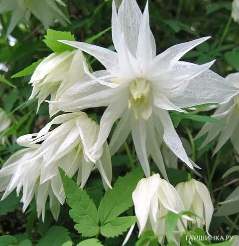 Клематис (Княжик) Альбина Пленa махровый (1) - Красивые цветки: белые, махровые со светло-жёлтыми тычинками, открытые колокольчиковидные, слегка поникающие. Обильно цветёт в мае -июне на прошлогодних побегах, но затем продолжает цветение до конца лета, на побегах этого года. С июня по сентябрь украшены декоративными пушистыми светлыми соплодиями. Выносит полутень. Высота 3-4 м. Диаметр цветка 6-8 см.
