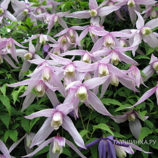 Клематис (Ломонос) альпийский Вилли (1) - Цветки нежно-розовые, колокольчатые, одиночные, диаметром 4-6 см, на длинных цветоносах. После цветения формируются пучки семянок с длинными пушистыми остями. Цветет в мае-июне. Высота 2,5 м.
