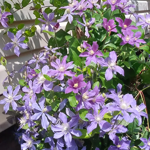 Клематис Арабелла крупноцветковый (3) - Прекрасное растение, которое все лето (с июня по сентябрь) обсыпано массой цветов, меняющих окраску с фиолетовой на голубую, с белыми тычинками. Высота растения достигает до 2 метров, диаметр цветка до 10 см. У данного сорта могут появляться цветки от белого и светло-голубого до насыщенного голубого.