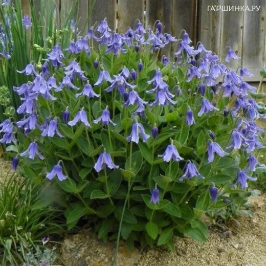 Сорт отличается изящными колокольчатыми цветками насыщенного фиолетово-синего оттенка, которые распускаются с июня по сентябрь. Клематис интегрифолия, фото и описание сорта которого привлекают внимание цветоводов, прекрасно сочетается с розами и многолетниками в миксбордерах.