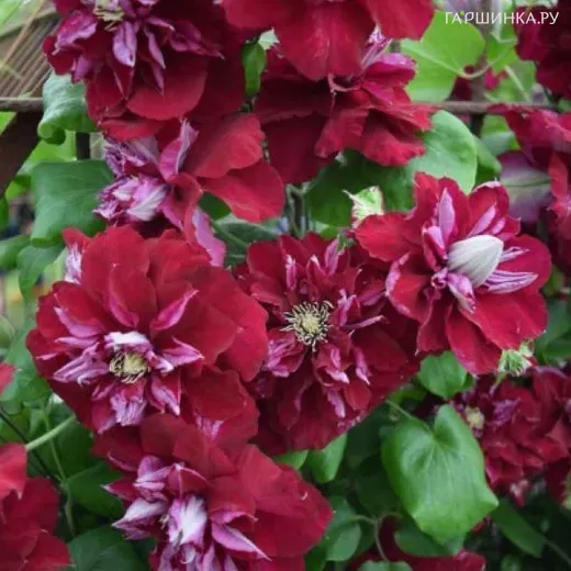 Клематис Чармейн (2) - цветки ярко-малиновые с желтыми тычинками, до 15 см в диаметре. Цвет очень насыщенный. Одновременно на одном растении распускаются простые, махровые и полумахровые цветки. Высота растения: 1,8 -2.5 метра. Нужно обеспечить ему солнечное, но защищенное от ветра место. Морозостойкость: до -34С